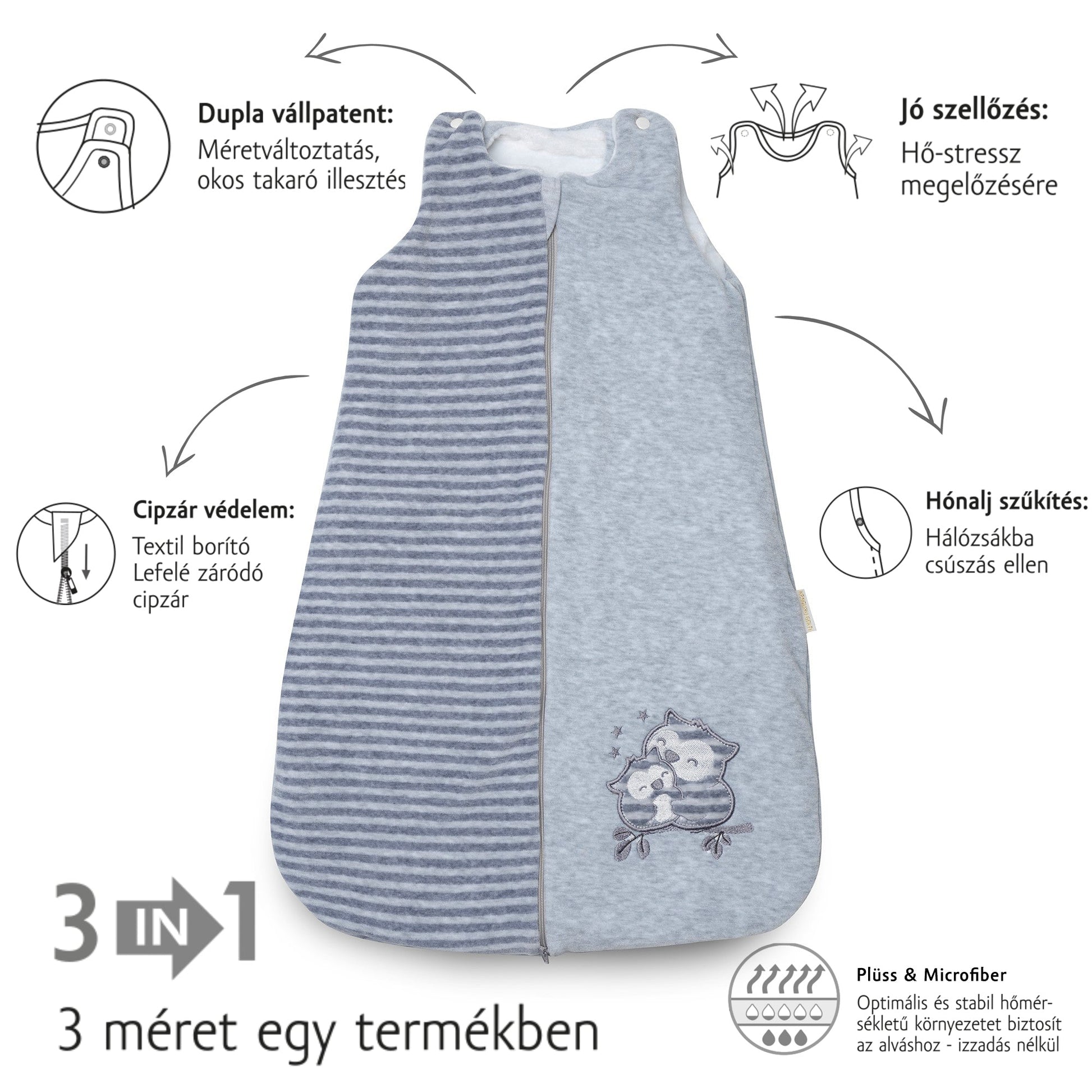 - Dupla vállpatent és hónaljszűkítő patent a csecsemő korának megfelelő nyílás beállításéra, a hálózsákba-csúszás megelőzésére