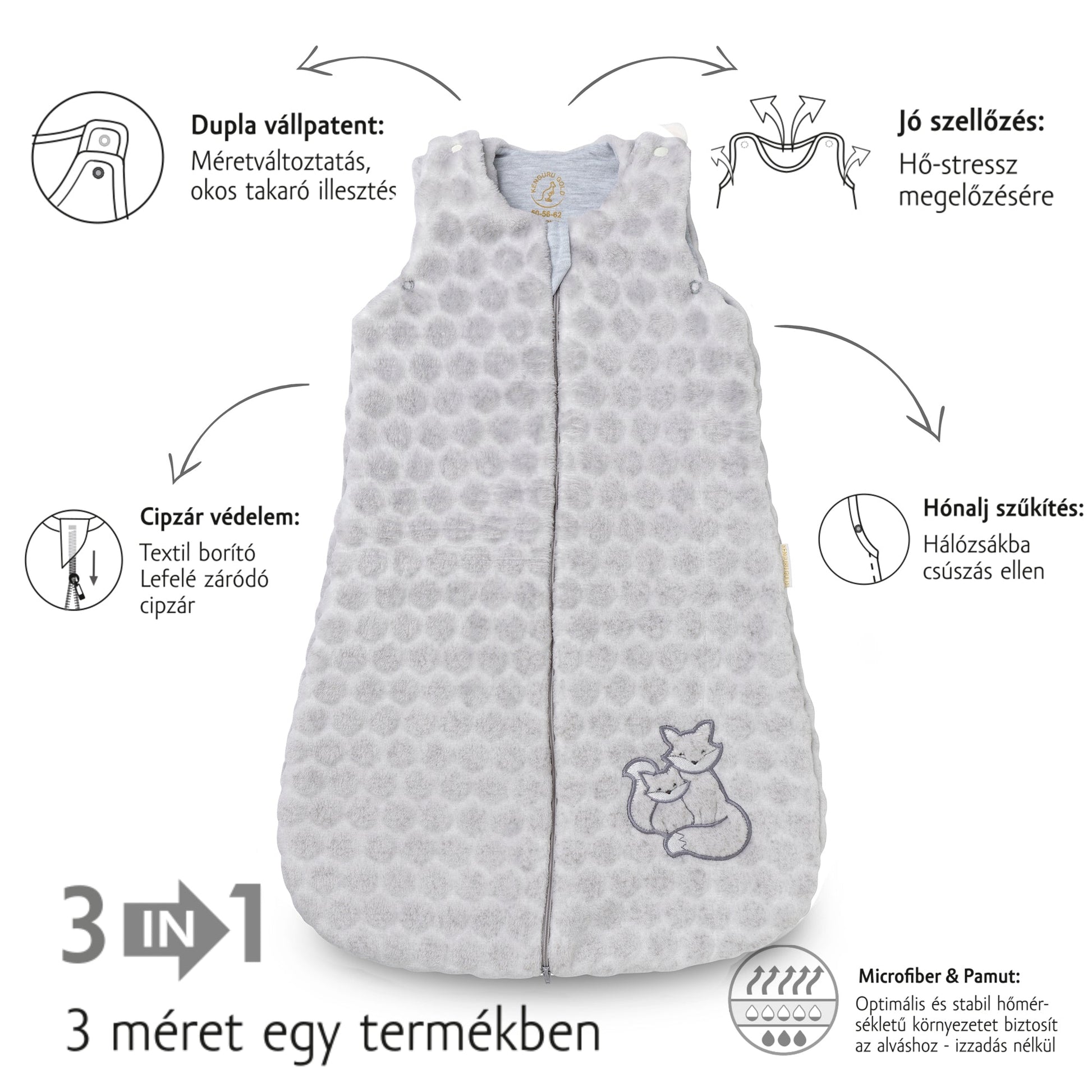 - Dupla vállpatent és hónaljszűkítő patent a csecsemő korának megfelelő nyílás beállításéra, a hálózsákba-csúszás megelőzésére